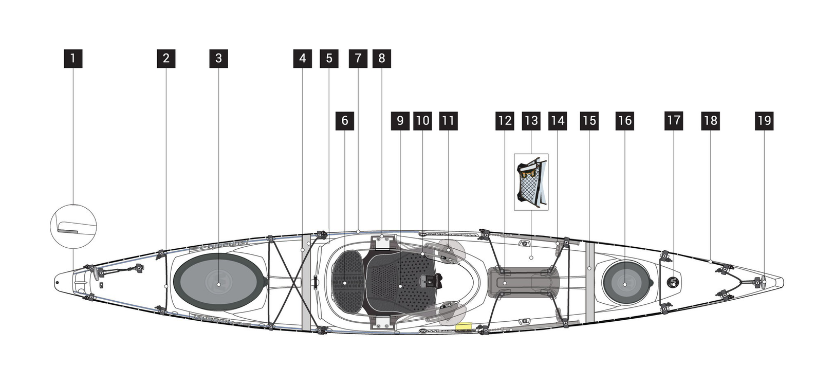 Les parois latérales évasées et l’augmentation du volume au-dessus de la ligne de flottaison ont été améliorées afin d’accroître la confiance et la stabilité du pagayeur, tandis que la ligne de flottaison plus longue augmente la vitesse et l’efficacité.